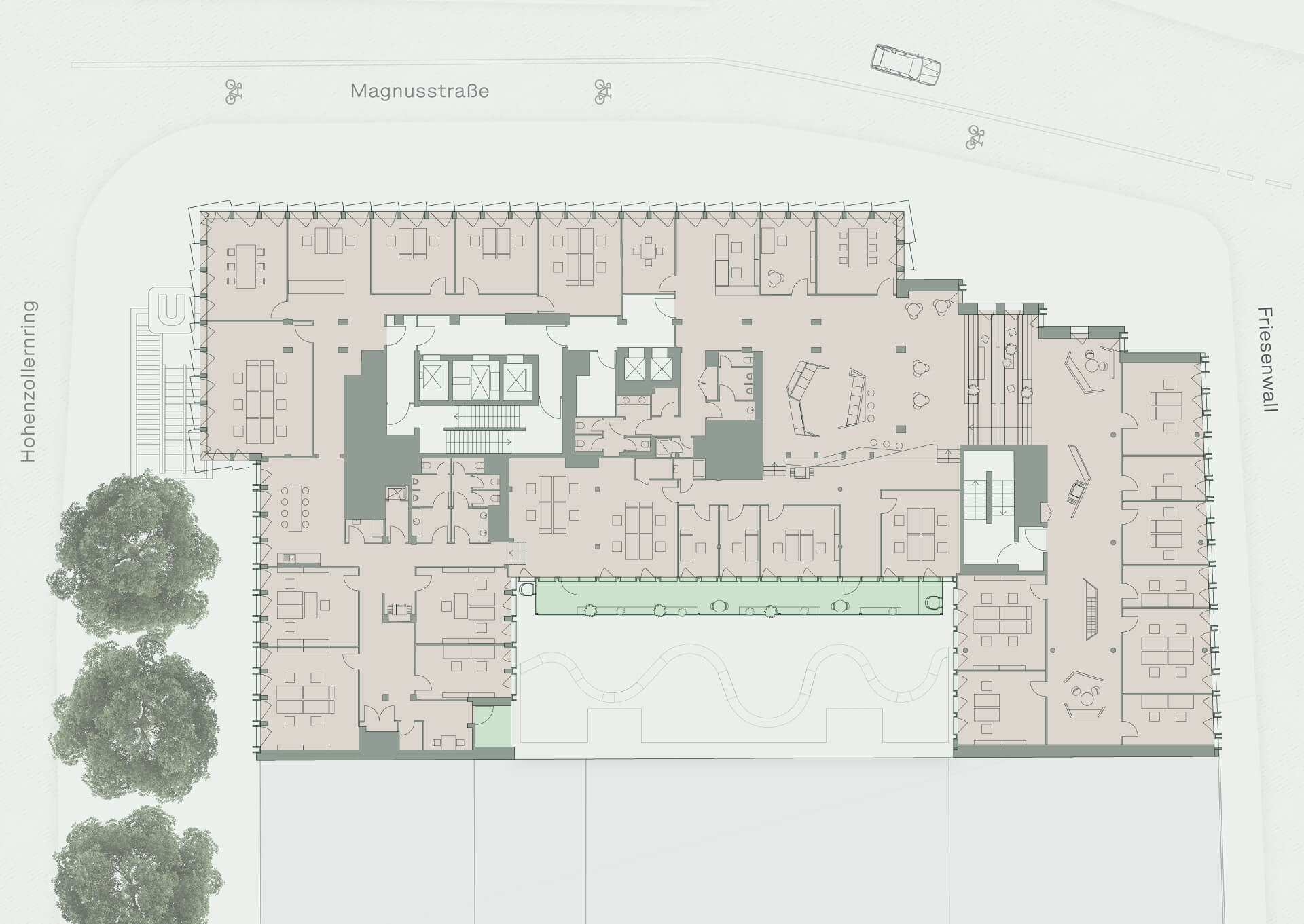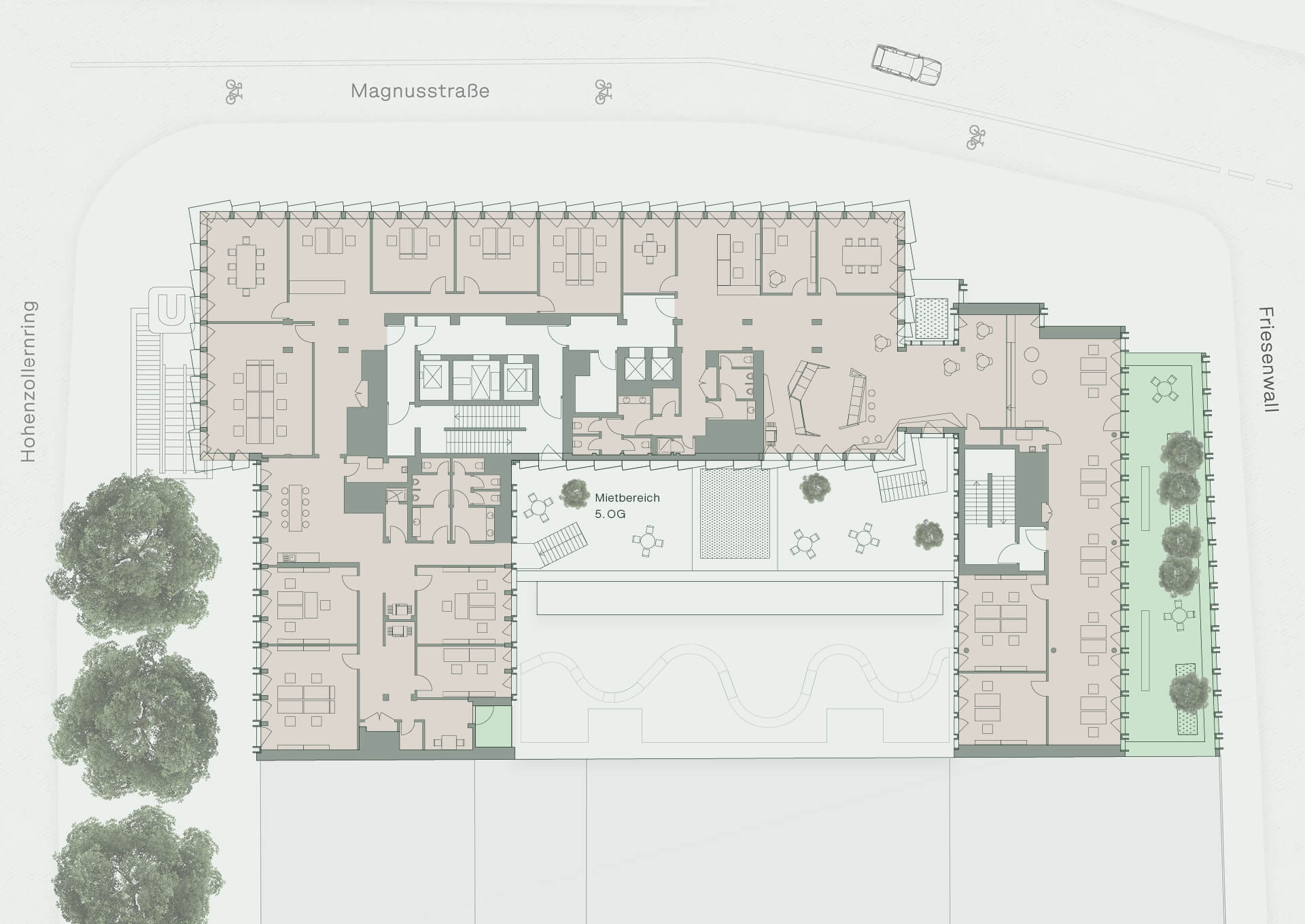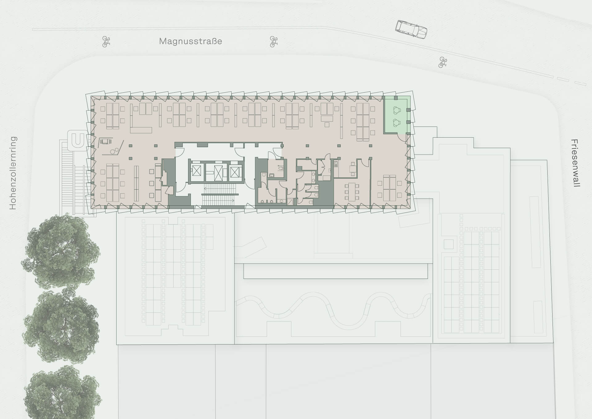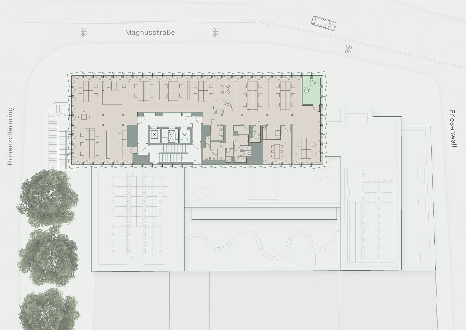 Die flexiblen Mietflächen des CENTRAL CROSS lassen sich auf Ihre individuellen Bedürfnisse anpassen. Die großzügige Begrünung im und am Gebäude schafft ein angenehmes Arbeitsklima.
